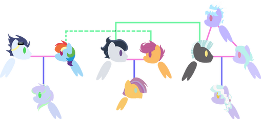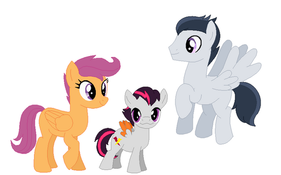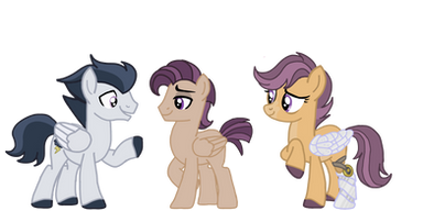 Rumble and Scootaloo's only son is named Boomerang. Nicknamed Boomer, this colt is a hoofball prodigy. Scootaloo is so greatful that Boomer can fly properly. Scootaloo, Rumble, and Boomer travel often. Scootaloo quit her job at the weather factory to help manage Sweetie Belle's tours. She always comes back to Cloudsdale in the fall to coach hoofball, much to Boomer's embarrassment. Rumble began working in the physical therapy field.
