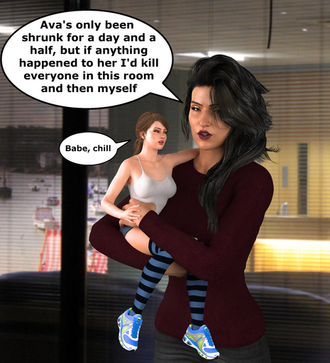 Oh my gosh! This is perfect! β€οΈ I love this scene so much. Iβm surprised at how calm the little woman looks though. Iβd figure most people would freak out if they were suddenly the size of a toddler. Sheβs probably too embarrassed and scared to freak out though! lol