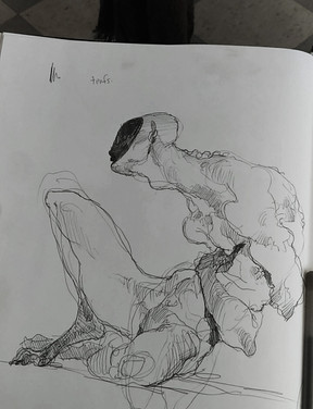 I start with a really rough outline just to get the shape in, then block in values starting with dark. This is usually just scribbles, which you can still see in some spots. It's important to start on a darker than white background so you already have a middle value down in your figure. Then start adding lighter values and go in with some details. I'd give ya a more detailed description but I don't really put much thought into my process lol