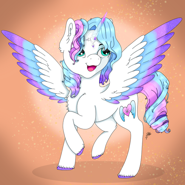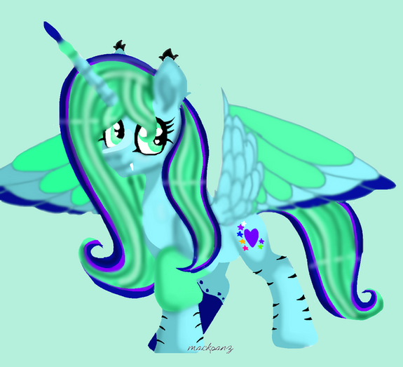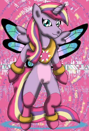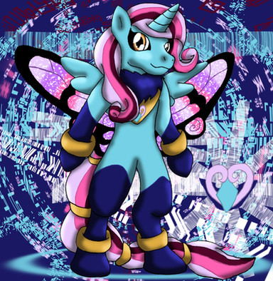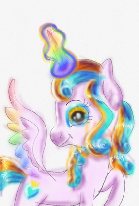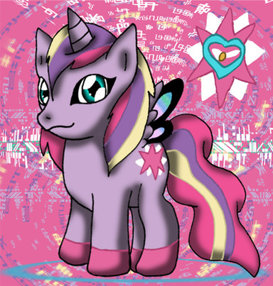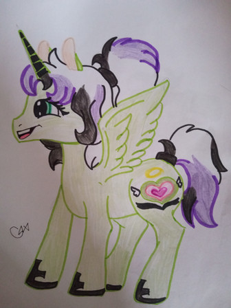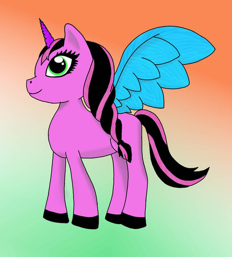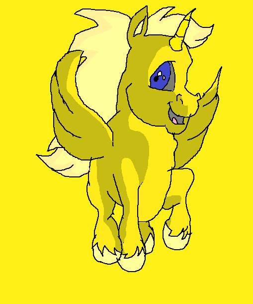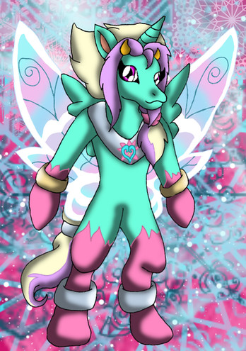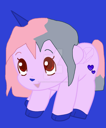 Here is a picture of my Digimon Zoryamon's In-Training level form called Machamon A cute filly with a blue unicorn horn, light purple and cream coloured mane and tail, little orange horns and little fairy wings