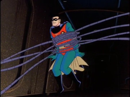 As Batman's wheel begins to turn, all he can think to say is "Take it easy...Robin!" Not exactly the most encouraging thing if you're on your way to being spun 1000 times per second.