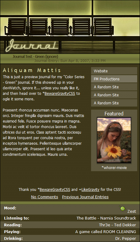 The header looks very nice. I like the chairs and the lighting. The overall green scheme is gorgeous, and I like how you've got features on the side. That way each entry can have a few thumbs. It makes it nice, simple and clean.