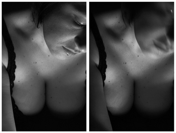 Strangely, I could not at all tell the difference until I stared at it for quite a while. Now I can kind of see. The only difference I see is the shadow of your stomach near the tattoo. And an added necklace