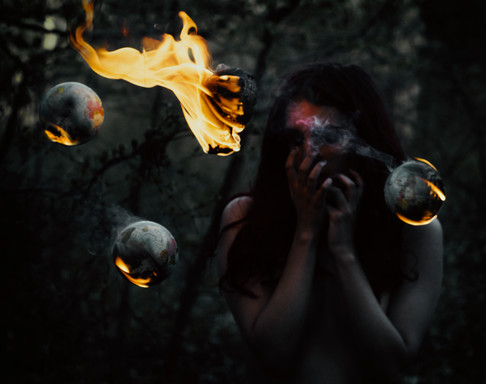 I like how her face is illuminated behind the dark flames. A conceptual work in the true sense.