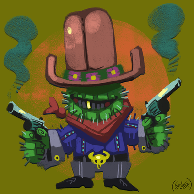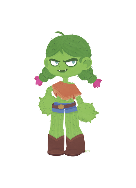 An old west outlaw dies of exposure in the desert and his decomposing body nurtures a small cactus girl to awaken prematurely. Though she has a childish demeanor, this fertilizing process gave her part of his personality, including his crude language and ferocity. :I