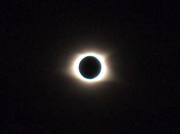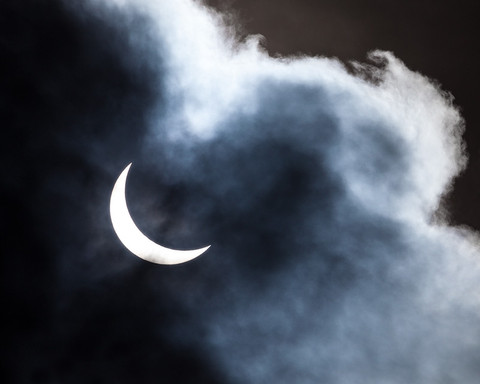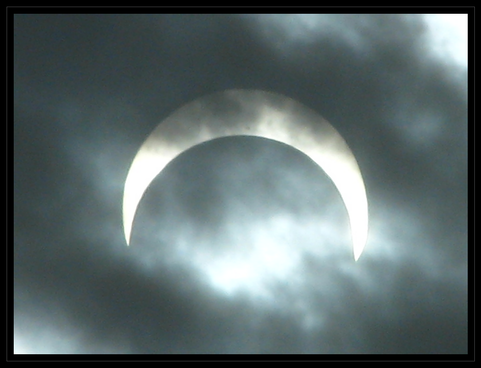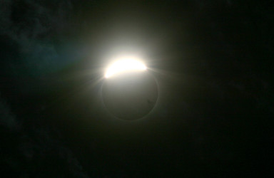 This was our (not very good) view of the total solar eclipse of November 2012, through clouds, taken from a point near Cairns, Australia. We were almost completely clouded out but we did get one or two dramatic peeks of the eclipsed sun. Here we can already see a red prominence at the 3 o'clock position and we can see the brightness of the sun's corona outlining the moon's top right side. A "Bailey's bead" of brilliant sunlight is still shining through a valley at about 4 o'clock on the moon's profile, and a thin band of not yet eclipsed sunlight is visible below and to the left of that.Related content