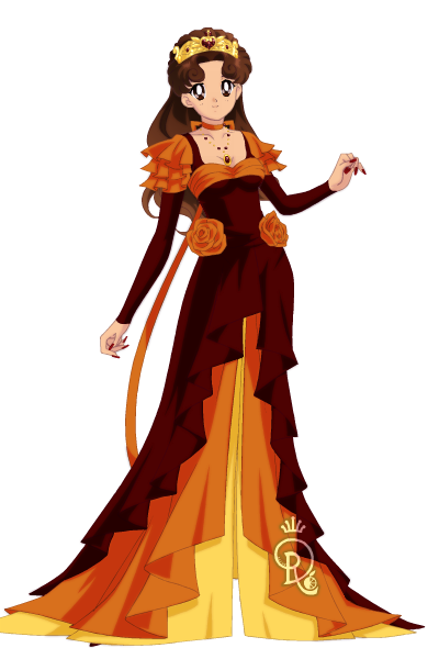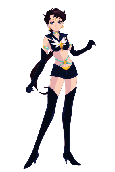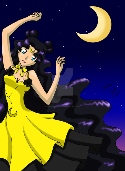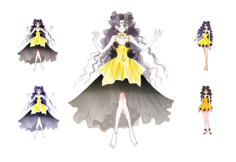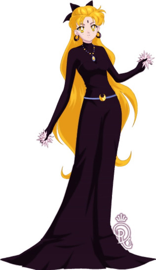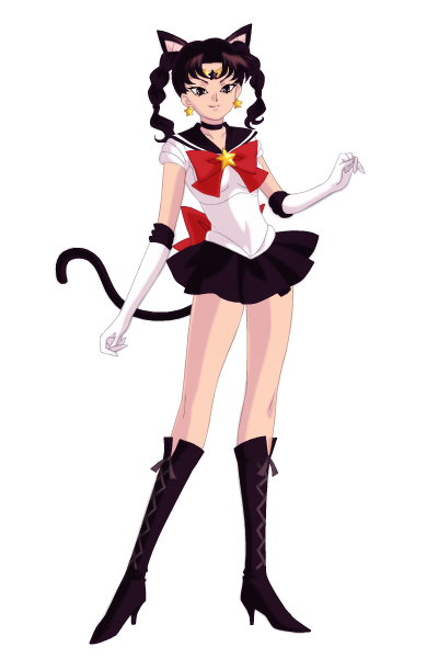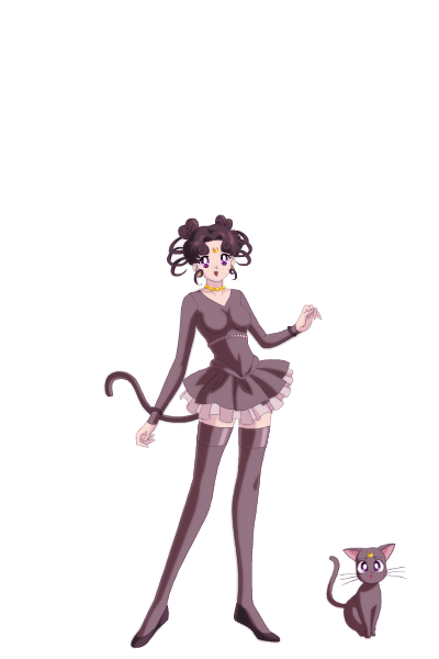 In her human form, Luna is a young woman with curly, long black hair which reaches her waist. Her forehead bears the same yellow crescent moon that she wears as a cat, and which are also featured on her earrings. A yellow ribbon is tied into a bow around her neck as well as crescent moon necklace. She also has an anklet of the same design above her foot. She wears an elegant, flowing gown which is yellow and black and is shorter in the front than in the back. Her eyes are aqua blue, and she appears to retain her cat-like features.