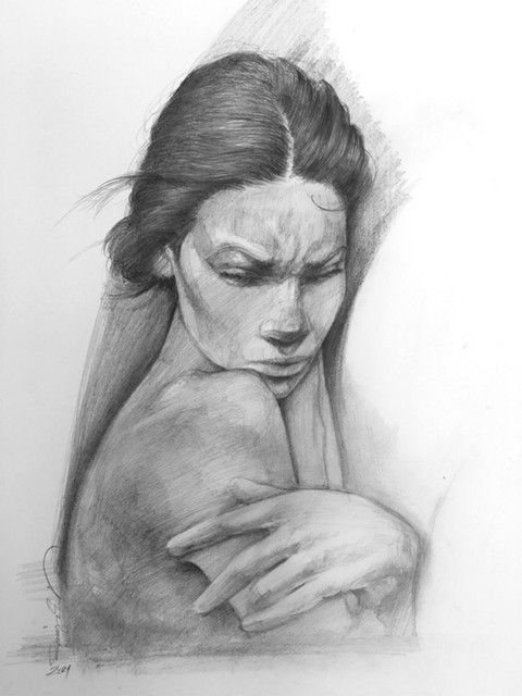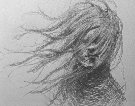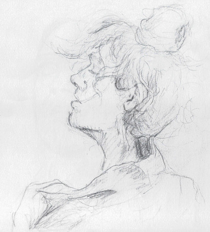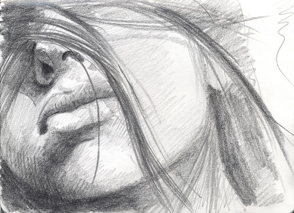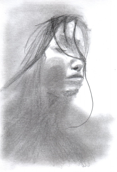 The hair and hand look great but there isn't enough on the face for the brain to fill in the rest. You are a tremendously talented illustrator so this is still a successful portrait.