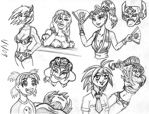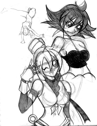 you see, the first drawing top left , the girl with the sword.... ^^ seems that her hips and legs are flat, and they were only angled.. X3 but the curios thing that is wasn't intentional... that's why it seems funny..