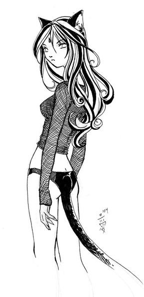 very dramatic appeal.. the inking is sweet, especially on the tail. the hair is interesting.. i like the stark black but the white highlights look a little odd or out of place. and the background i admire