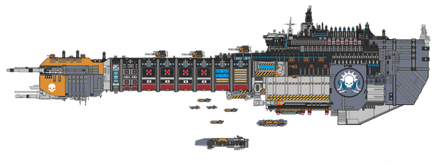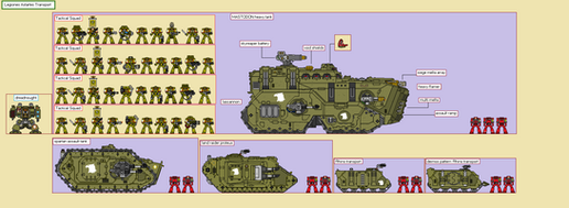 Spartan Assault Tank huge war machine that deploys into warzones even the mighty Land Raider would be torn asunder. Able to transport 25 space marines in power armour or ten in dreadnought terminator, fitted with pair of sponsons fitted with a deadly quad-las-cannon battery and twin-mounted heavy bolters. Additionally, it is considerably faster than land raider variants despite its increased size, due to its reactor-driven motive drive systems and secrets.