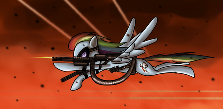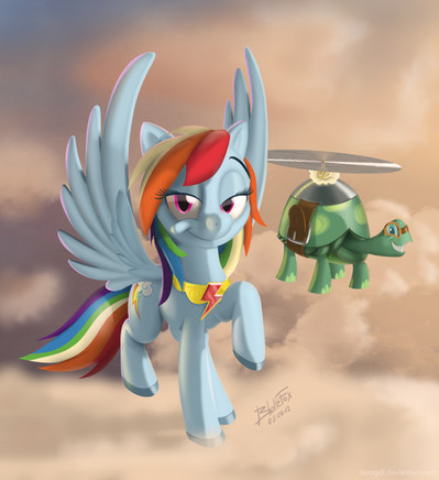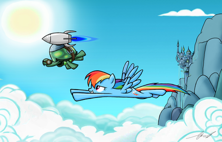 This is the reverse, having Rainbow Dash(In place of the soldier) sitting on a sword saying "Drive me closer, i want to hit them with my tank" (Tank being the tortoise in this case and not the vehicle)
