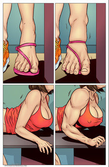 The process of becoming a giantess is indeed my favourite. I love the emphasis on her dwindling shoe and the enhancement of her musculature. The expression is also endearing.