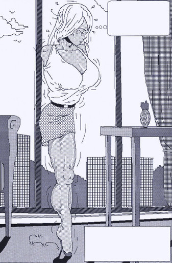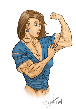 I like the way you've captured her expression, as she transforms into a big-breasted, tall, and muscular Amazon.