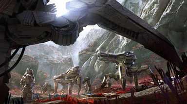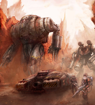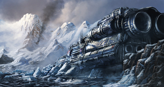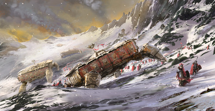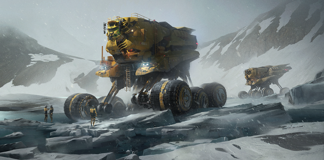 I love winter environment scenes. Snow is almost like a character in and of itself. When treated right it really looks amazing and you've done a great job on it here. That big mechanical construct is a cool design too. I love those huge stabbing claws for feet.