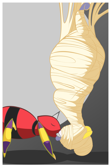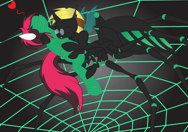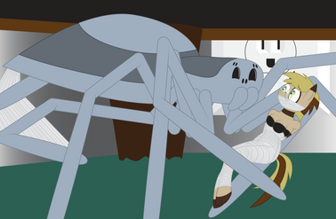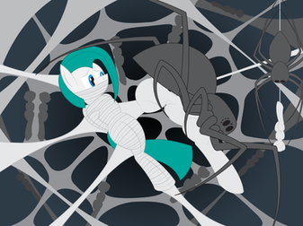 His wonderful silk firmly pins my arms to my sides and then covers my head, pinning down my mane and ears before covering my eyes. Now deft and blind I pant in excitement, I'm so helpless, I'm completely at his mercy! I moan as I feel him raise up my hind legs and wrap them, leaving the bottom of my hooves exposed. I give my binds some playful tugs as I bask in the inability to resist, just accept. Now done, he decides to lay on my belly, enjoying the warmth of live, wriggling prey under him. I laugh as I realize my lower quarters are exposed for all to see, how kinky! What is he planning? Maybe he's going to make me his broodmare? The thought is both really weird and in my current state of mind, so hot!~ Yet, he seems content to just rest on my belly, his long spider legs curling around my body, hugging his favorite and most willing prey that always comes back to where she belongs.