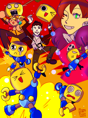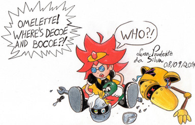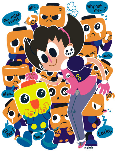 Nooooo, Cubot! And Orbot looks so sad for him!... and also for himself. Not sure who the OC is, but she's cute, too. And your OC is *fabulous* as always. Poor little Cubot...