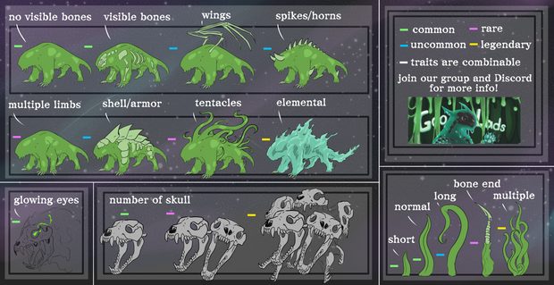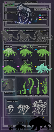 Hey! I made a new specie called Goolads. Here's what I got for the lore, they have the same lore universe as another species called Felimp:Goolads are the result of Hell and Heaven's overpopulation. As there was no more room in those two dimensions, some souls had no other choice but to roam on Earth. A few of them managed to reincarnate through bones and magic residues of other dead beings. With the presence of those souls and the bones, this magic residue manifests as a goo-like / slime material.