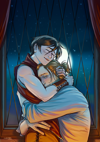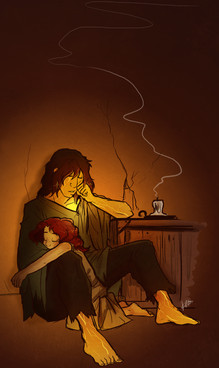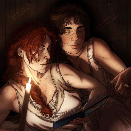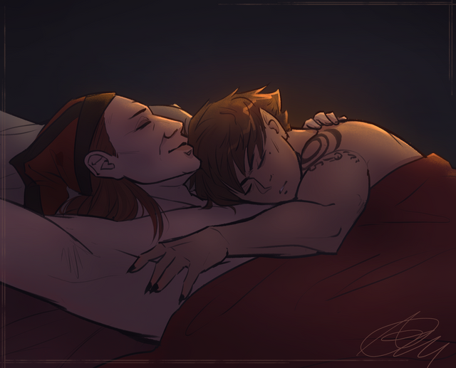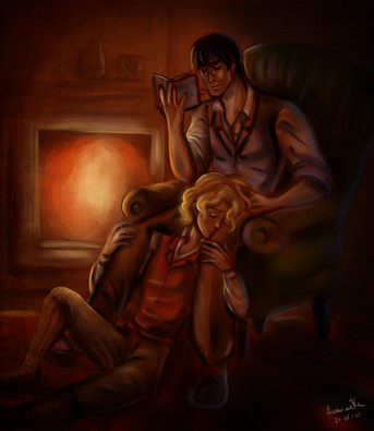 Поки я сповнена любові до Цицерона, мені хочеться малювати якомога більше ніжних моментів з їх історії.На цьому малюнку Кас і Цицерон відпочивають у Данстарі. Теплі обійми холодною зимою під цікаву книжку(сподіваюсь). з щоденників Цицерона можна зрозуміти, що він охоче поглинає нову інформацію, особливо пов'язану з Братерством. Цікаво, що б він читав для відпочинку? Щось про майстерство вбивства чи кроваві детективи? щось таке...