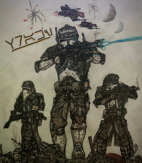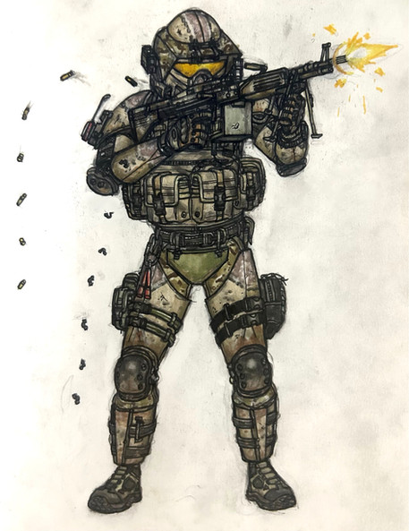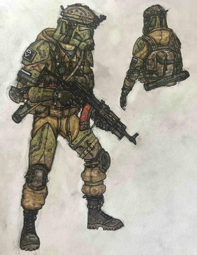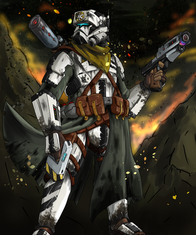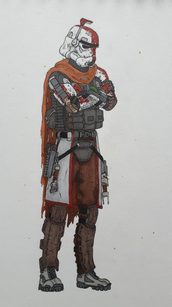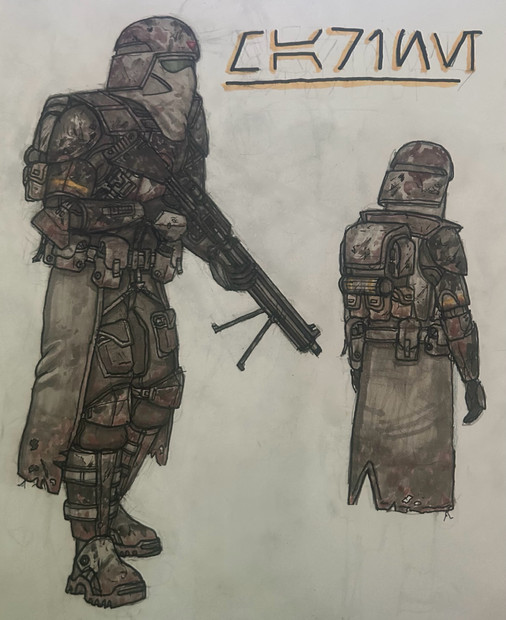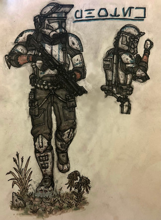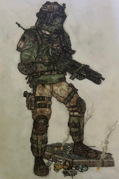 This is CC-4193, otherwise known as Commander Phobos, the lead commanding officer of the GAR's 218th Ranger Battalion. His extensively modified armour features a sun visor, infrared designator system, comms antenna, a jump pack, and a myriad of extra power cells and grenades to sustain his weaponry. His main weapon of choice is a DC-15A blaster rifle fitted with a holographic sight as well as a bipod, in addition to his UGL-51B grenade launcher which can carry up to five explosive shells at any time. The 218th, one of the many units active under the 7th Sky Corps, was a unit that specialised primarily in fast-paced airborne infantry assaults against heavily fortified enemy compounds, and also commonly went on missions involving direct action and arresting high-profile targets. Similarly to Commander Cody, he would commonly be seen up front, leading his troops head-on into the fray as opposed to taking up a more administrative position from the safety of a command post like most other officers of his rank.Post-Order 66, he would be re-assigned as a drill instructor for Imperial special forces candidates on Daro, and would serve the Empire throughout the entirety of its lifespan. During the final years of his life, he would continue his service as a DI for New Republic trainees, until subsequently retiring and succumbing to old age.