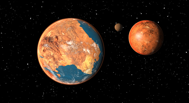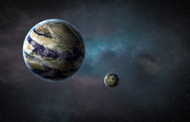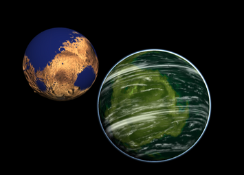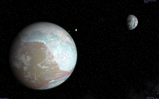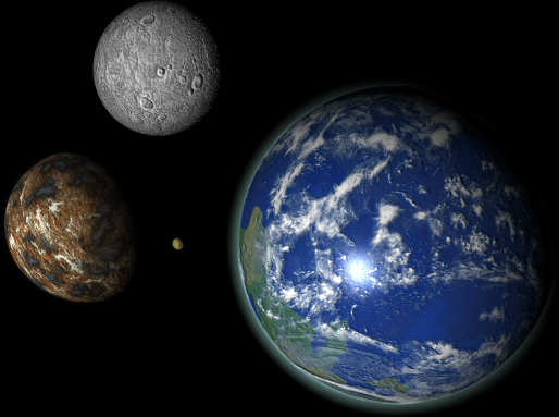 Here it is, my 100th deviation!Here we have 3 of the gas giant Iofiel's major moons. In the background we have the habitable moon Elohim, then the volcanic world of Nathaniel and finally in the foreground we have the wet mars-like moon called Isda.