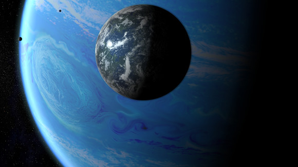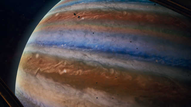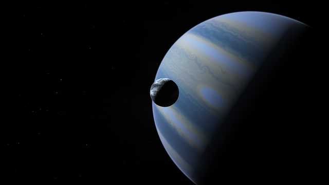 The small volcanic moon of Iofiel, Nathaniel, is shown here with it's parent planet in the background. Of the 5 major moons of Iofiel, Nathaniel orbits just outside the planet's Roche Limit, that is, the limit of where a moon can retain its spherical form and not get destroyed by its parent planet gravity. Hence, Nathaniel is a world living on the edge of existance, being battered by Iofiel's gravity, and its magnetic field, Nathaniel is the perfect image of judeo-christian hell. With a radius of about 999km it has just enough gravity to be able to hold on to a faint, and out gassing atmosphere of CO2, Sulfur and other volcanic gases. In fact, the atmosphere is constantly being lost into space due to the extremely weak gravity, but the constant and violent volcanic eruptions on this gravitationally tortured world keep replenishing the gases at almost the same rate as they are lost. A world of constant change, and a permanent fixture in the Elohian sky.Gas Giant Texture made by