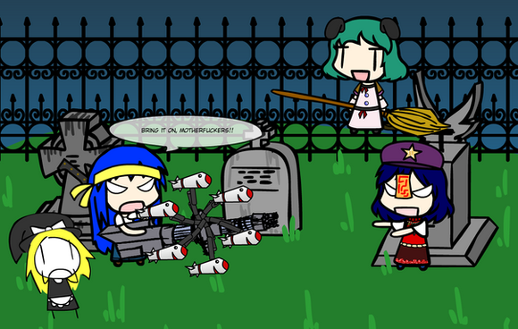 Yukkuris are invading!What do we do? Give the miko an AK-47, of course! *shot*