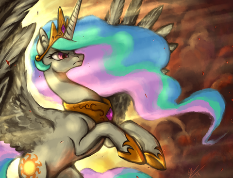Celestia's eyes scanned the burning city once again as she flapped her wings hard and provided more magic of fire to rain down. She watched Twilight and her friends scramble to help citizens out of the city, always looking back at her with a look of utter fear. She saw Luna on the highest balcony in Canterlot, ordering her guards to take down her solar guards and to help the citizens as she failed to take control of the moon.