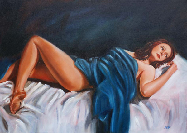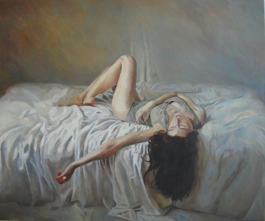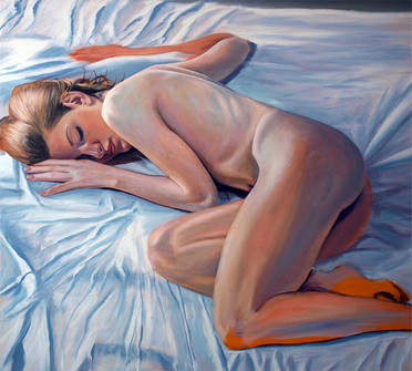 Oil on canvas.My intention with this painting was to try and depict both innocence and sensuality – hence the title. Originally it was to include broken angel wings, crushed underneath the figure, but I decided it was all looking a bit obvious (they are still there in the under painting – which is a nice thought). After I decided to lose them, I even had a few scattered feathers around for a while. In the end I was convinced that the piece was better with the only angel reference being in the title. The sheet she is laying on still has echoes of those angel wings.