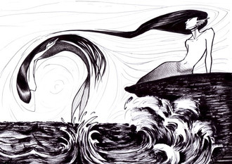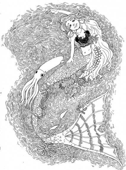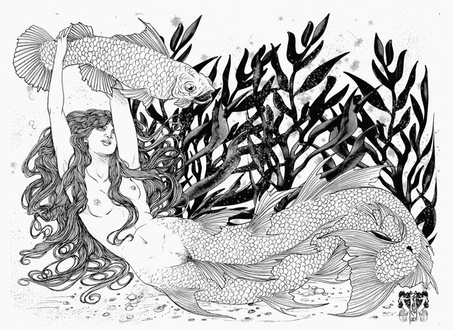 Ink drawing of a mermaid with an eel, some fish and a jellyfish among a bunch of seaweed. This started with just her face and the seaweed on her shoulders, and then it grew a life of its own from there, with no forward planning or sketching involved until it filled the entire sketchbook page. Quite the opposite from my usual approach, but I enjoyed trying it. Hope you like it!Follow me on Instagram for more frequent updates with sketches, WIPs, and more.