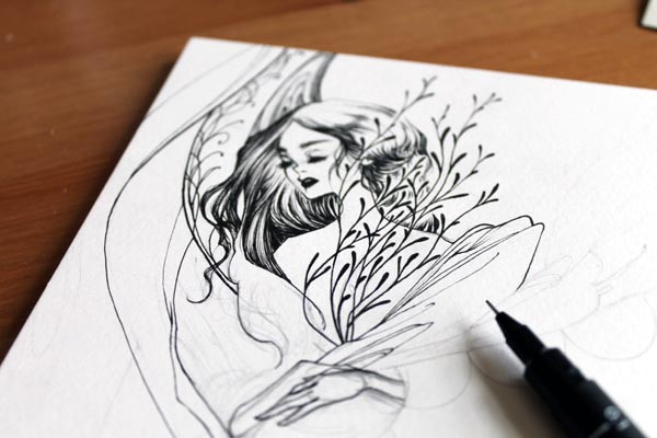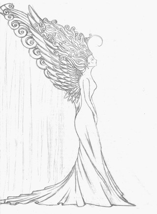 Ballpoint pen drawing of angel under two arching branches.Related pieces: