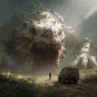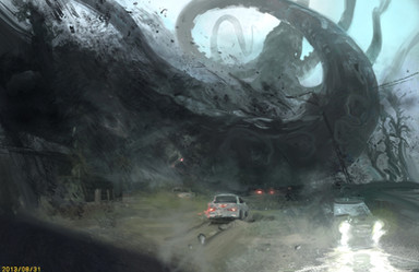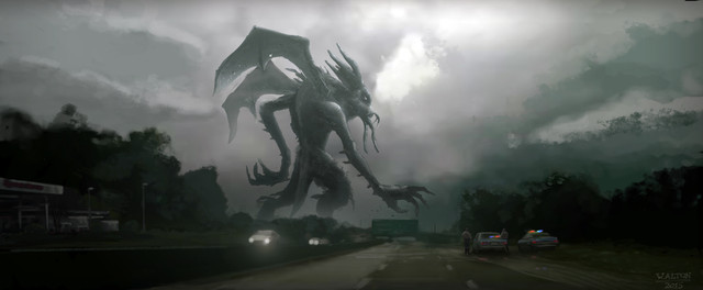 This is...one of the most frightening images I've seen in a while! There's a lot of monster art where the viewer has no way of relating to the image, and the monster is simply fantasy. But adding these two people that seem like they could be your neighbors, with the modern elements of the road sign and the road itself and the car, really helps to draw the viewer into the image and for a second see themselves as part of this scene. Really incredible work, and love the teeth of the monster!!! Awesome, really!