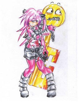 for Alice....hair should be blond , with a tinge of orange , eyes Red ( think Albino people)....clothes you anyhow wack....just bare in mind that unlike her bike , her clothes don't need to be dull.....but don't go crazy and give her pink clothes cos it doesn't fit the profile........heheheheh...she's a fighter , rugged and tough but not Evil....the eyes is part of the story plot.....she suffers from some mad cow disease that gives her red eyes....
