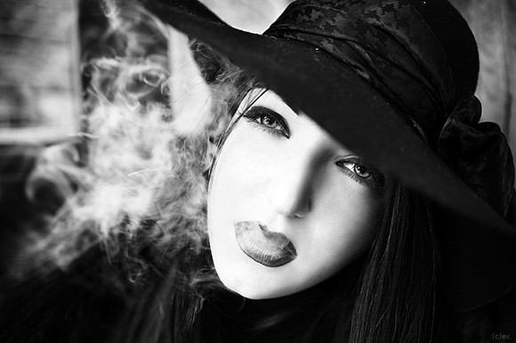 Little Red Riding Hood sits on scene, on a chair, drinks martini and holds sigarette.