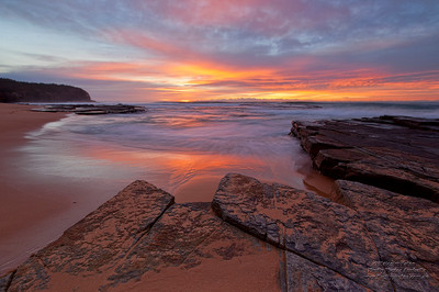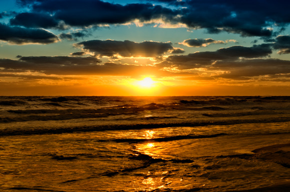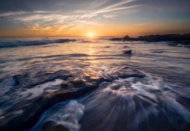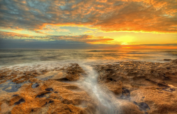 HDR image of sunrise and ocean swell on rocksRelated content