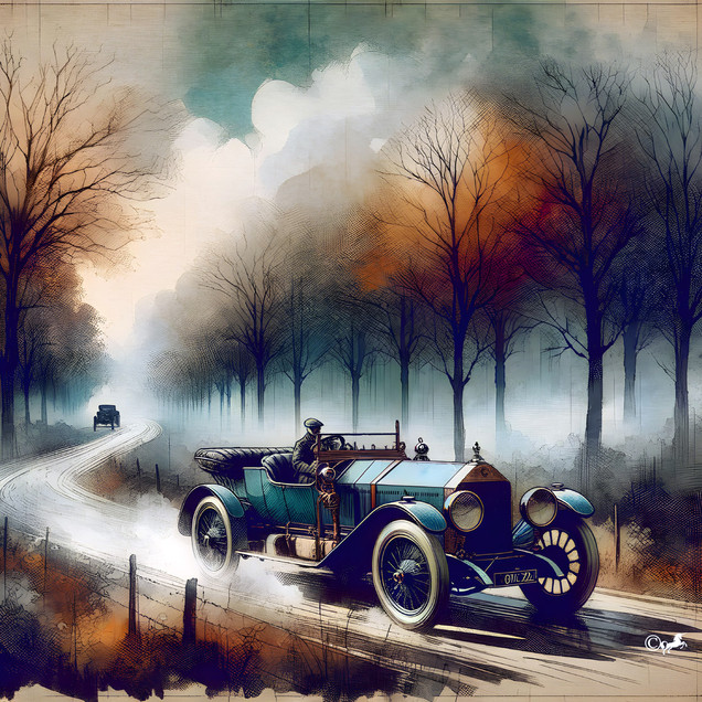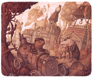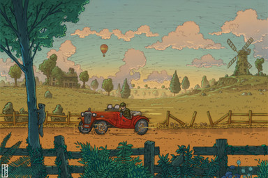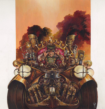 I really, really love the coloring here, especially on the car, how you can tell it's blue, but all rusty and stuff as well. Everything has that ..we'll call it "well used" quality. And I love the expression on the driver, all jammed down on the wheel, it makes me grin every time I look at it.