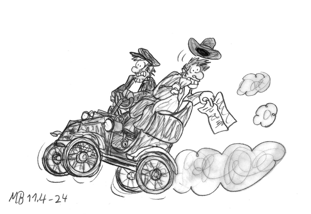 This is hilarious. I really like it. The jalopy came out superbly. Is it missing a headlight? I love the small details you threw in as well, like the corn-cob pipe. This is amazingly colored. The movement in it is great, too. That's hard to do! The driver's look of utter determination is awesome. I wish I could see what was following the crew. I would think one of those cartoony police paddy-wagons brimming with old fashioned police officers and their clubs. Great job!