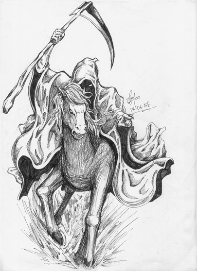 Last of the 4 Horsemen of the Apocalypse. Represents death. The bible has no mention of the scythe in the rider's hand, but I figured it suited the whole purpose of the drawing. I also made the horse look very 'zombie-ish' with areas where only the bone is visible, scars and cuts throughout, etc.Color pencil
