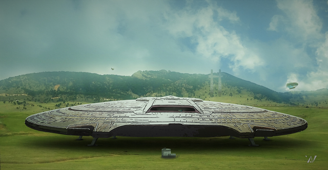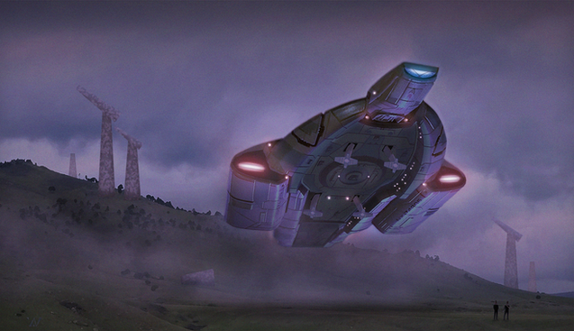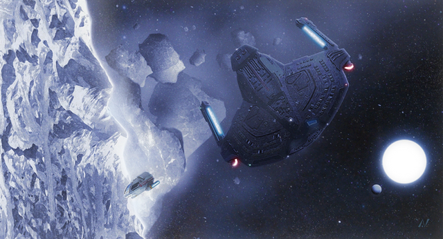 Note: I love the opportunity to do "aviation art" for Trek when I learn that the ships from canon I'm working on operate in atmosphere or at least CAN operate in atmosphere. There is something special about the light and perspective that I love. As an aside, I originally titled this piece "Bajoran Guppies" as I love how these little raiders look like fat little fish with a mean attitude.