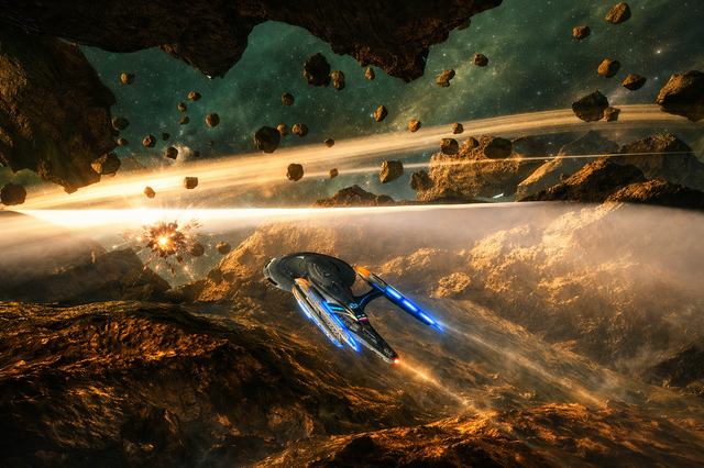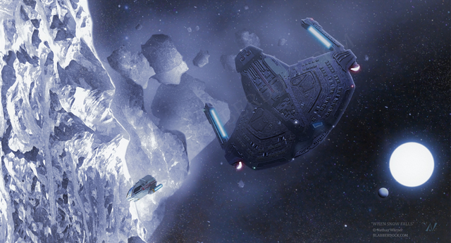 The U.S.S. Yeager, A Saber class starship, investigates reports of a mysterious force that is pulling the Bicaria solar system's Oort Cloud in towards the populated planets. The comets are many times larger than the Earth's entire Asian continent and pose a serious safety risk to the planets in the system. An away team is being dispatched to one of the larger comets surface to investigate fluctuating energy readings that can't be localized. Below them, they can see mountains many times larger than Mt. Everest as they fly through billowing clouds of ice and snow. What will they find in the caverns and caves below?