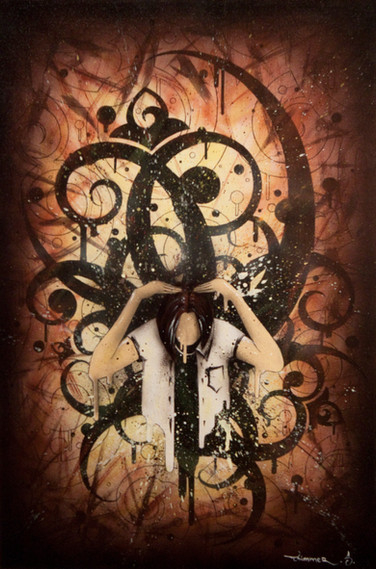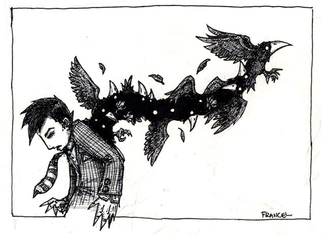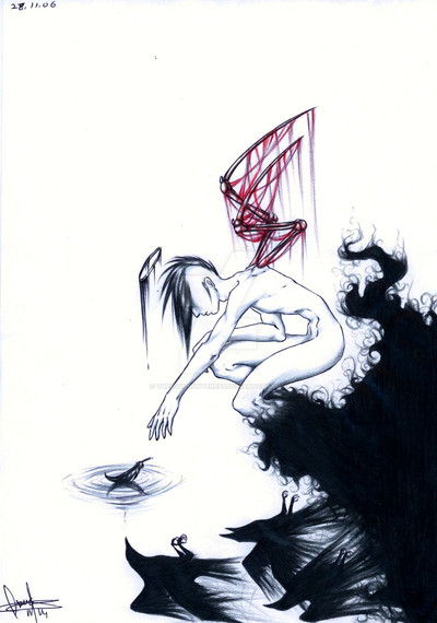 Whoa....heh. It was cool; at first glance, the crow's wings sort of mirrored the big explosion of stuff coming out of his head. That's a neat effect. Nice detail in what looks like intestines or something the crow's pulling out of his head. Awesome use of colors. o_O I love how the yellow borders it, it brings out the light yellow framing the actual picture behind all the black and red. It's awesome how I can see the texture in the paper too. :3