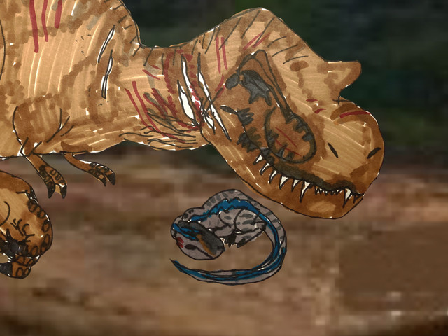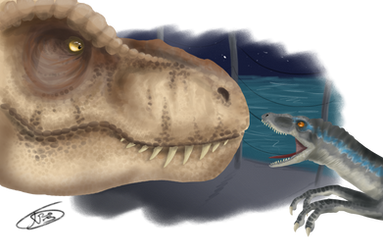 Well since this was my favorite chapter because those lines stuck in my head for a while. I decided to draw them with Rexy picking up the scent of the paintball gun and conspiring with raptors. Now that was funny.