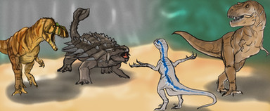 "What the?!What are they doing?"The Control Room went silent as Blue gave a high jump to catch the old dinosaur's attention, and Rexy lowered her head. Lowery blinked a few times before stuttering, "I-is that a paintball gun?!"