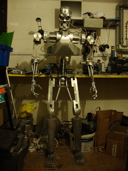 This is the full size Terminator endo skeleton that I sell at my store. It's a very nice collectible but very expensive. This was the first model which is a shiny chrome, the second we have now is a battle damaged model. The price is $5,950 plus shipping and it varies on where you live. We also ship to other countries. For example if you live in the U.K., the shipping price is close to $2,000 or £1,000. The price would be £3,000 for the statue so all together for the U.K. is £4,000 but you don't get to pay taxes if shipped out of state or country.Related content