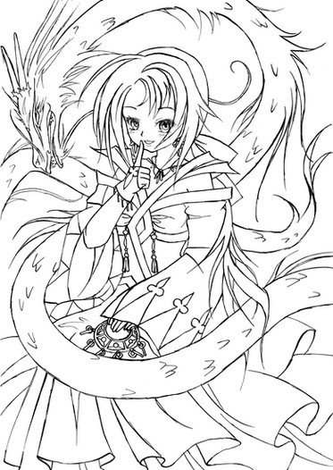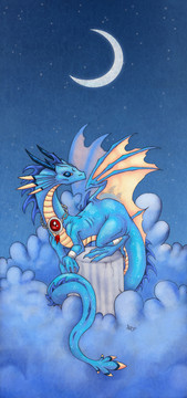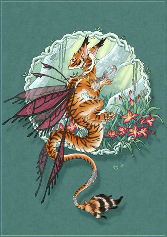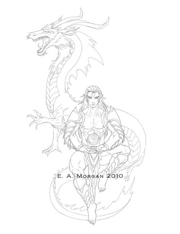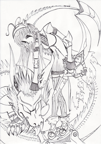 The dragon was drawn on a different sheet of paper, then scanned and mirrored in photoshop. Lannie was drawn afterwards, keeping in mind the circular design .