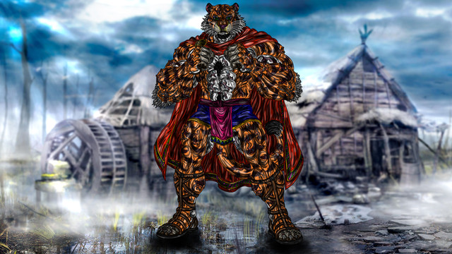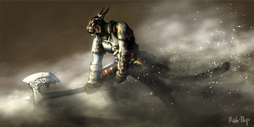 The blade is quite ornate, but does little compared to the impressive and wholly unique looking physique of the being fighting the bondage of those appendages. The entire mood itself is really beautiful and seamless. The pupil-less eyes seem to be something the being has given over to that which constricts him/her..but thats just my thought.