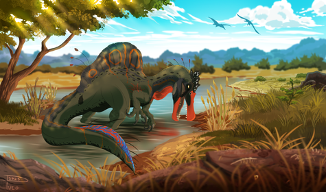 Such a beautiful picture! I love the lighting and the Spino's design, especially the whiskers! And the little avians are such a nice touch. Spino has food, and they're small, no reason for it to be a threat to them. They'll probably get to pick its teeth clean or eat pieces of food it left lying around that were too small for it to bother with.