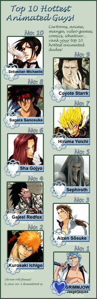 **GrimmIchi (image sourced from a doujinshi cover "Punchi Drunk") --I wasn't really big into yaoi before (not that I was homophobic), but watching/reading Bleach and discovering the chemistry between Grimmjow and Ichigo -and BAM!- sort of changed my world, in away and I started to appreciate yaoi more and eventually picked up the courage to draw yaoi when I loved the pairing far too much to not draw them at all. My point is, GrimmIchi was what influenced me to draw yaoi (although admittedly I've done a few pics of an OC slash pairing between me and a friend's OC long before GrimmIchi, but the feeling was a whole different level, so to say).