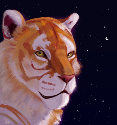 I initially tried to make an anthropomorfic character, but couldn't fit the head in a non-weird way. So, I started to make some changes, and when I painted the realistic body, my mind clicked and an Aaron Blaise artwork where a leopard (if i'm not mistaken) is drinking water from a pond.