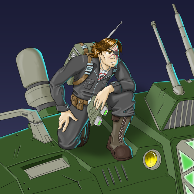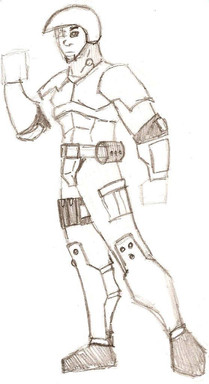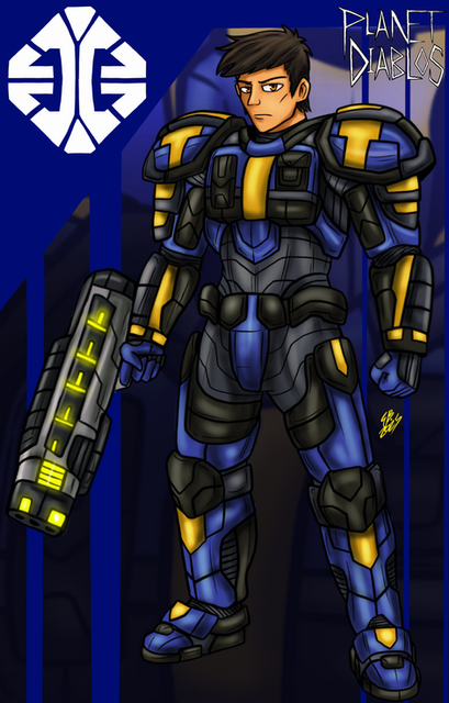 The weapons look really cool, but maybe make the lights glow a little to make it look more electronic, it only needs a small glow. I think the shading looks good on the picture too but with the shine of the amour would make the picture stand out much more. I think you have mostly done a good job though. I also like the they way you have broke up the gray with blue, it is a complementary colour but stops the picture from looking too dull.